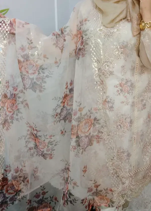 অর্গানজা ওড়নায় রয়েছে ক্রস এমব্রয়ডারি ও কাটওয়ার্ক—হালকা ও গর্জিয়াস লুকের জন্য পারফেক্ট।