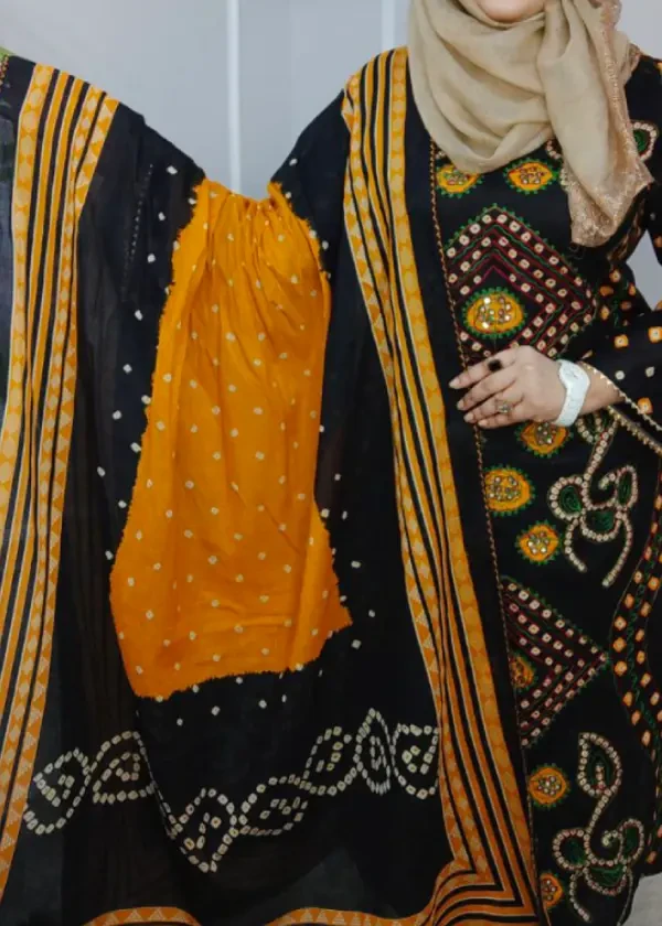 উন্নত মানের জয়পুরি কটন ফেব্রিকে তৈরি। পুরো কামিজে রয়েছে সুন্দর চুনরি ডিজিটাল প্রিন্টের সাথে ডলার ও আরি এমব্রয়ডারি কাজ, যা ড্রেসটিকে করেছে আরও আকর্ষণীয়।