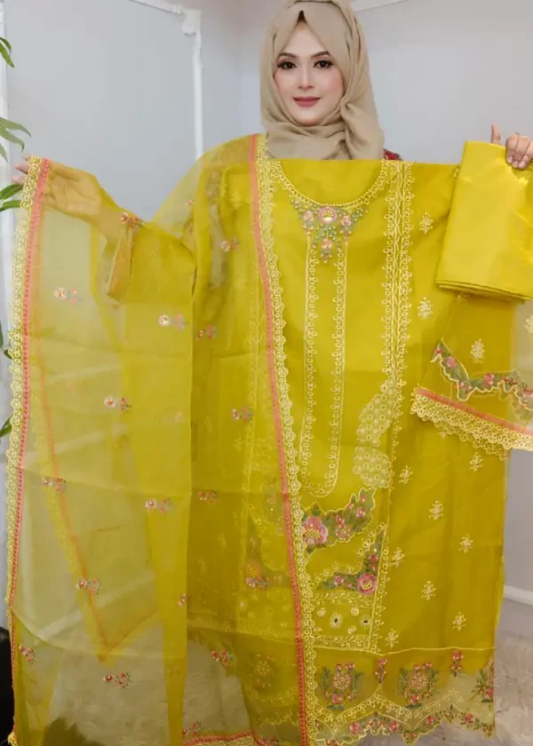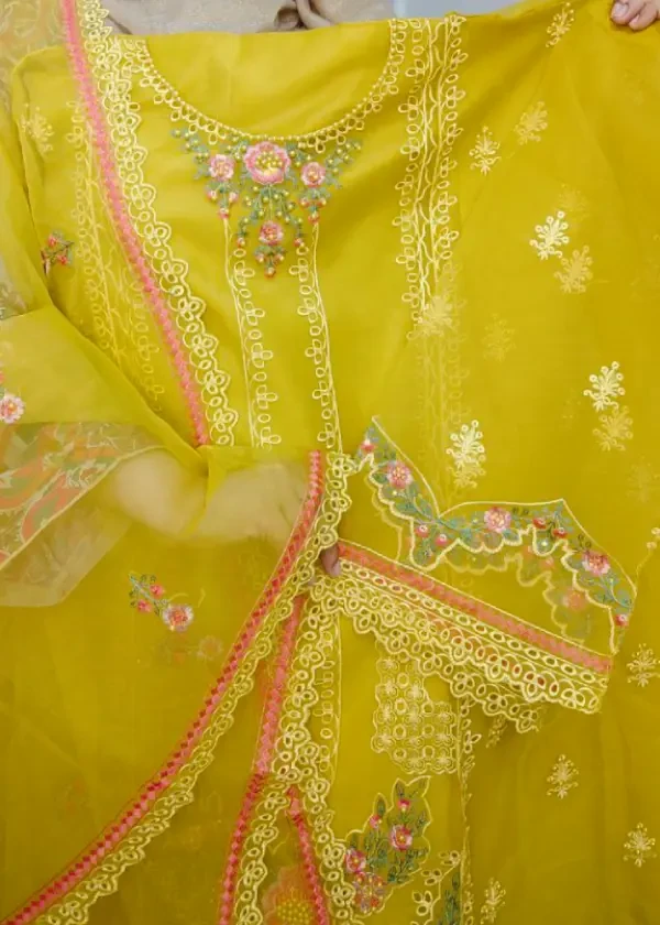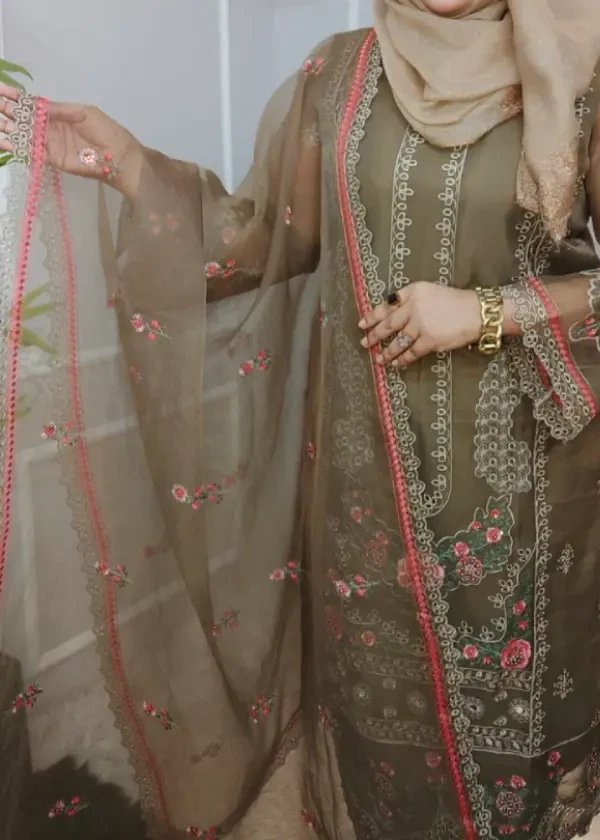মোসলিন অর্গানজা ওড়নায় রয়েছে বাওয়ারিং এমব্রয়ডারি এবং কাটওয়ার্ক, যা পুরো লুককে আরও এলিভেট করে।