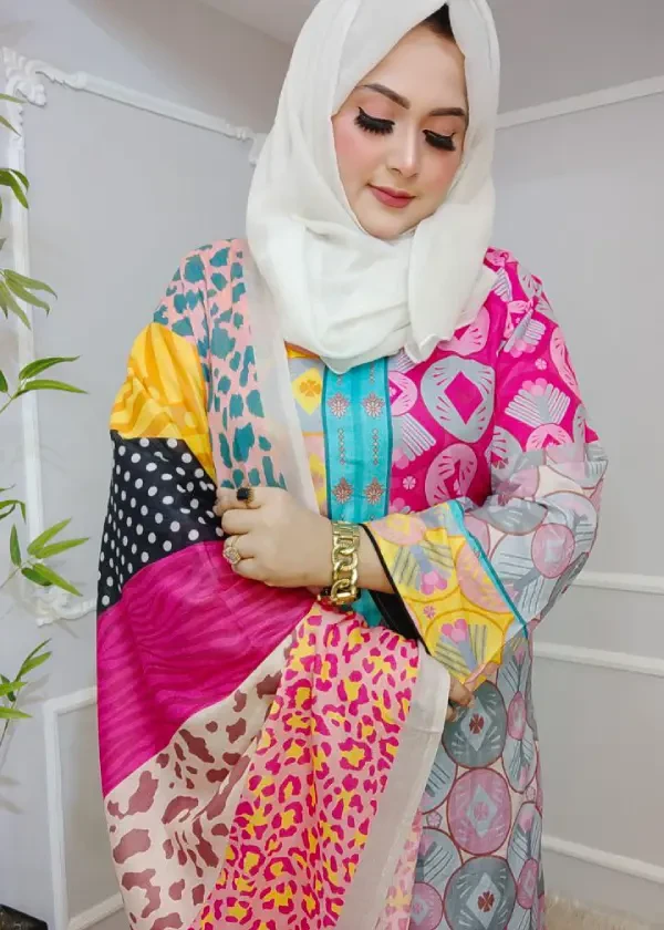 নরম কটন লন কাপড়ে তৈরি। পুরো ড্রেসে রয়েছে রঙিন ডিজিটাল প্রিন্ট, যা ড্রেসটিকে দিয়েছে এক ফ্রেশ, প্রাণবন্ত এবং এলিগ্যান্ট লুক।