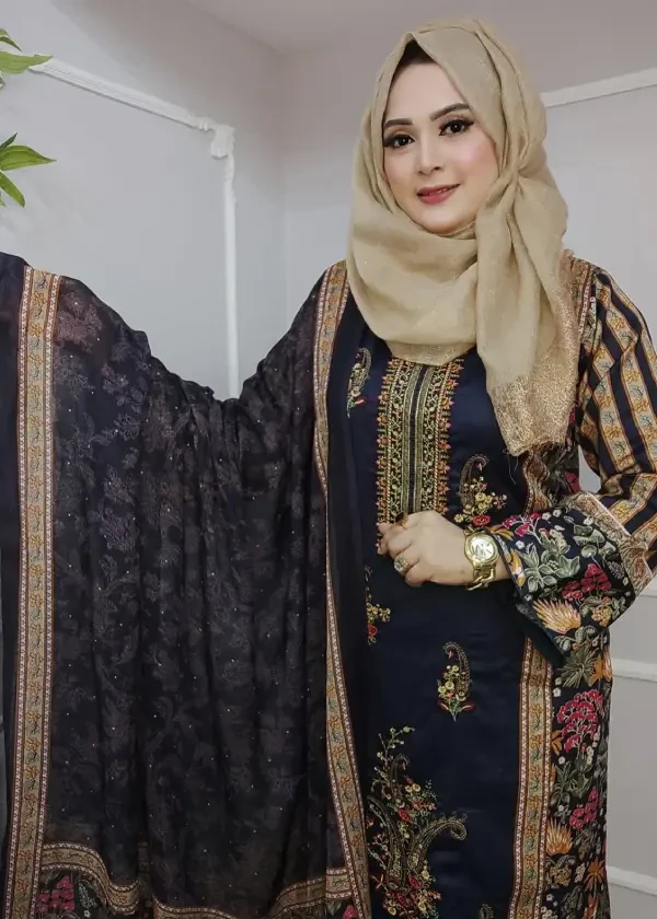✨ ব্লেন্ডেড জ্যাকার্ড ডিজিটাল প্রিন্ট উইথ কলকা এমব্রয়ডারি থ্রি-পিস ✨