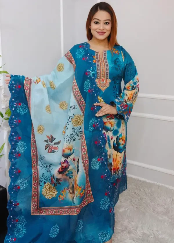 উন্নত মানের কটনে তৈরি। সিকুইনস শিফলি এমব্রয়ডারি ও বো-রিং কাজ কামিজটিকে করেছে আরও গর্জিয়াস ও আকর্ষণীয়।