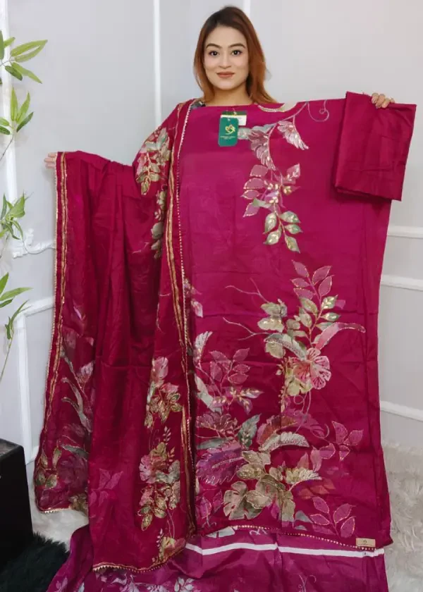 প্রিমিয়াম মোডাল সিল্ক ফেব্রিকে তৈরি। পুরো কামিজে রয়েছে স্টোন, সিকোয়েন্স ও ফয়েল জরি কাজ, যা ড্রেসটিকে দিয়েছে একটি গর্জিয়াস ও রাজকীয় ফিনিশ।