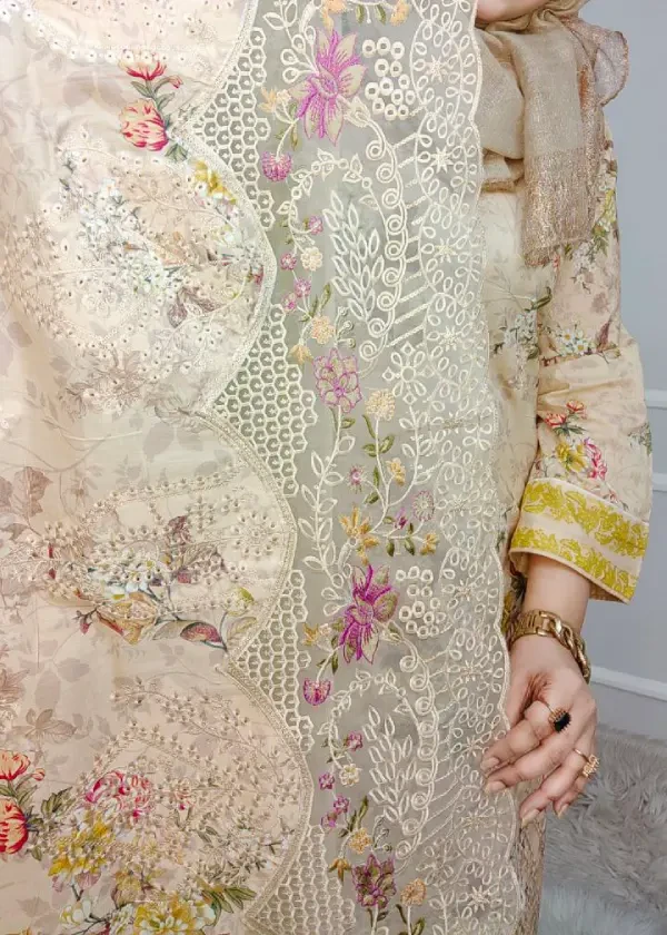 কটন ওড়নায় রয়েছে লেজারকারি শিফলি এমব্রয়ডারি কাজের সাথে অর্গানজা প্যানেল, যা পুরো সেটের সাথে পারফেক্টলি ম্যাচ করে।