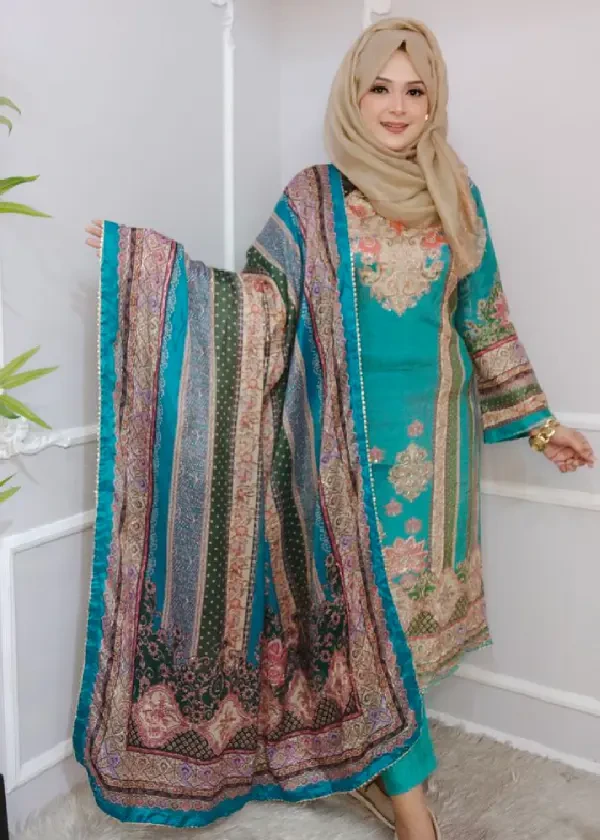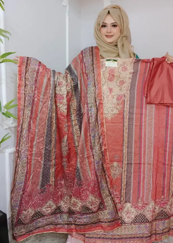 প্রিমিয়াম মোডাল সিল্ক ফেব্রিকে তৈরি লাক্সারি কামিজ, যেখানে রয়েছে স্টোন, ডলার ও ম্যানুয়াল ফয়েল জরি ওয়ার্ক। সাথে স্যান্টুন সিল্ক প্যান্ট ও একই কাজের মোডাল সিল্ক ওড়না—ফেস্টিভ ও স্পেশাল অকেশনের জন্য পারফে
